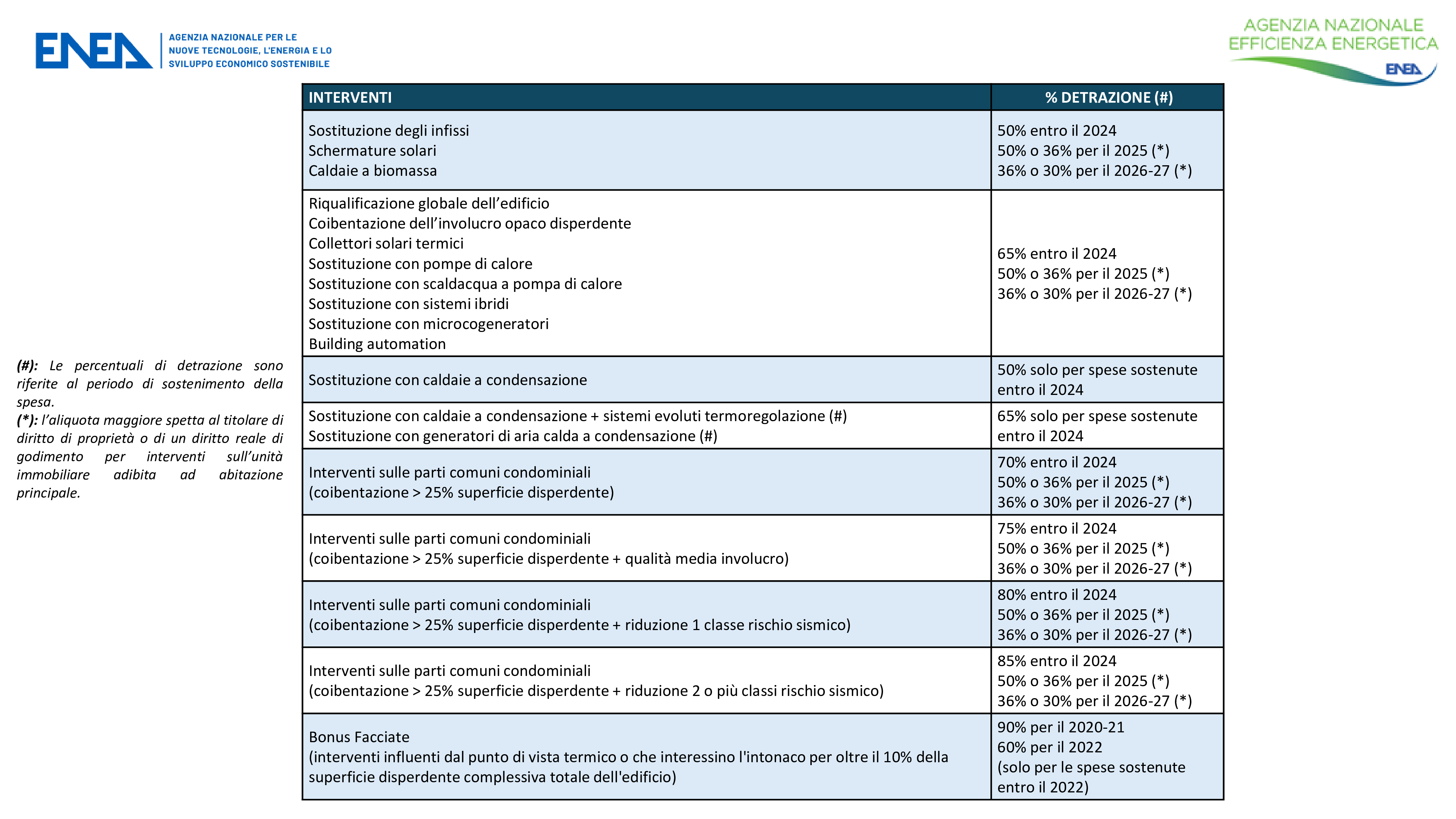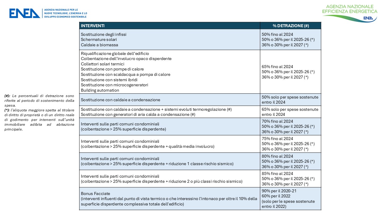 La seguente tabella sintetizza gli interventi incentivabili con gli Ecobonus e le rispettive aliquote di detrazione.